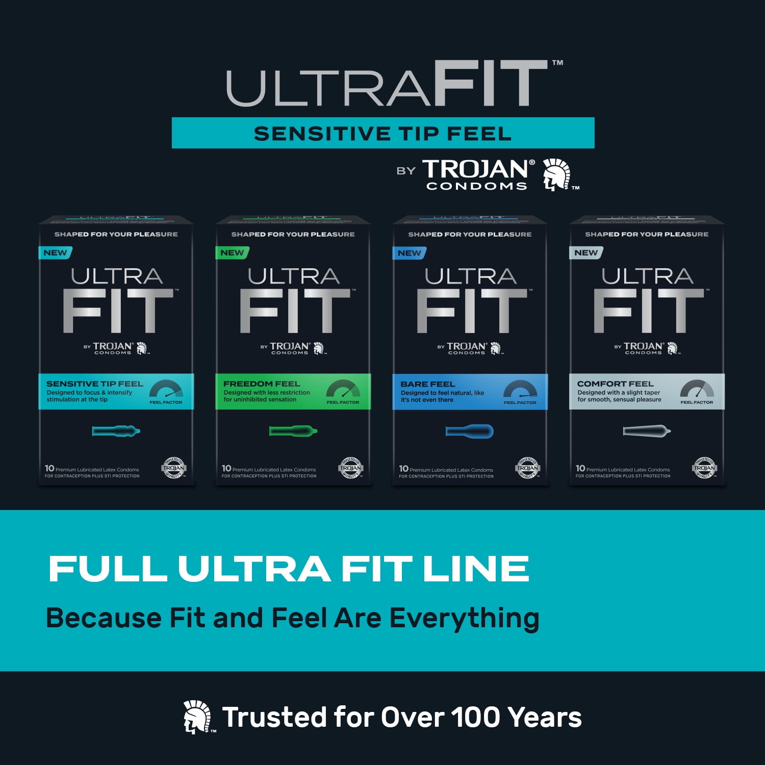 Trojan Ultra Fit Comfort Feel Trojan Ultra Fit Freedom Feel Trojan Ultra Fit Sensitive Tip Feel Trojan Ultra Fit Bare Feel each an Eligible Product. A shaped condom is the key to unlocking your finest fit and feel. Trojan Ultra Fit Freedom Feel condoms feature a unique form to give you the feeling youve been looking for.